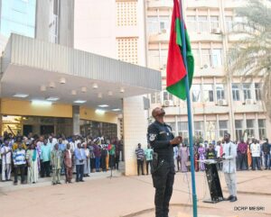 Ce 05 janvier 2026, les travailleurs du Ministère de l’Enseignement Supérieur, de la Recherche et de l’Innovation (MESRI) et ceux de l’enseignement de base, étaient mobilisés pour la traditionnelle cérémonie de montée des couleurs nationales, au rythme du ditanyè entonné en langue nationale Gulmacema. La cérémonie était présidée par le Pr Samuel PARÉ, Secrétaire Général du MESRI, en présence du Dr Honorat Charles Roger NEBIÉ et de M. Valentin BOUDA, respectivement Directeurs de cabinet des ministres en charge de l’enseignement supérieur et de l’enseignement de base.