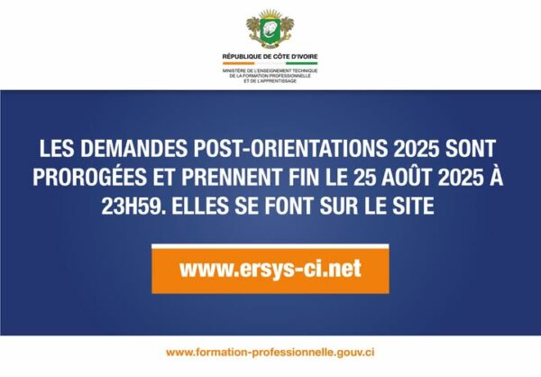 Paradmin147619 août 2025Les demandes post-orientations sont prorogées et prennent fin le 25 août 2025 sur le site www.ersys-ci.net . sont concernés: – les candidats admis...