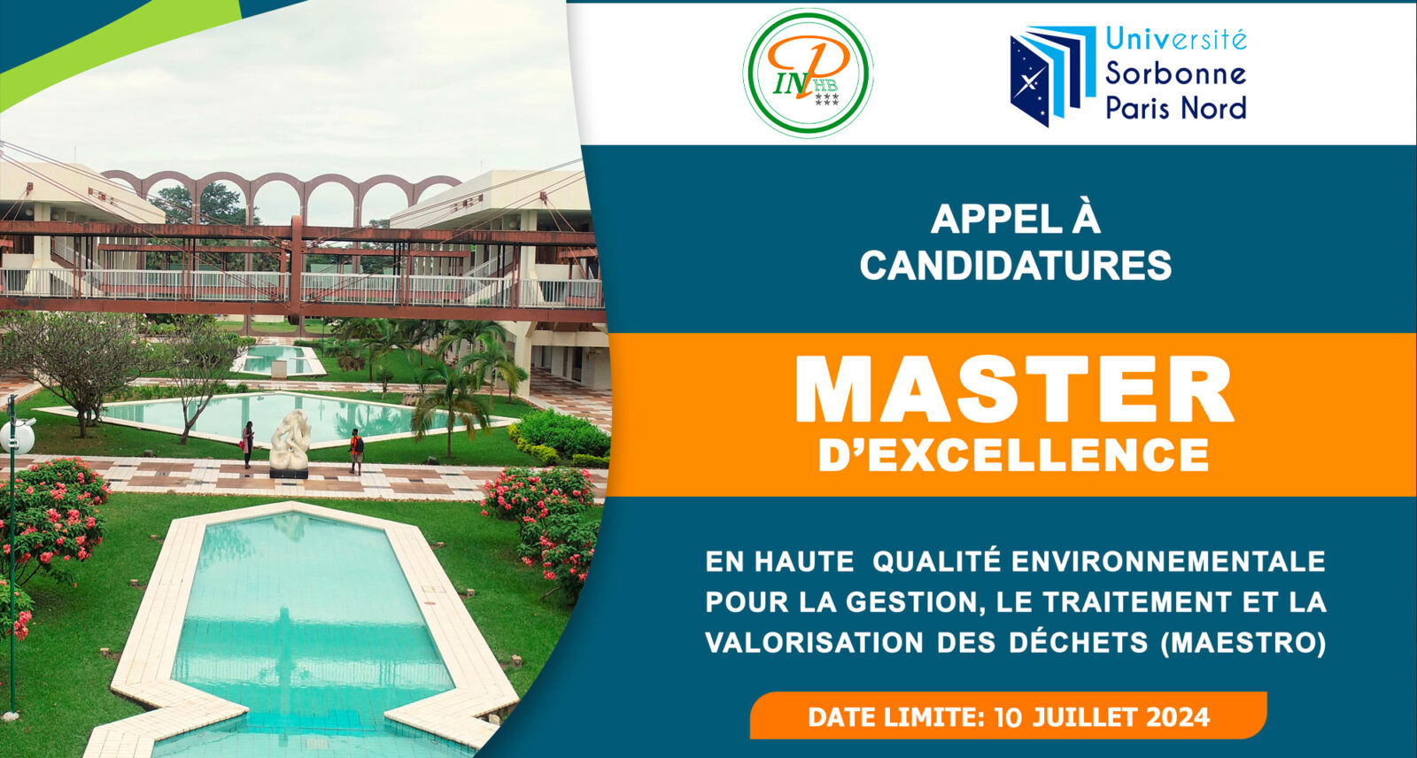 Le Centre d’Excellence d’Afrique pour la valorisation des déchets en produits à haute valeur ajoutée (CEA-VALOPRO) de l’INP-HB et l’Université Sorbonne Paris Nord (USPN, France) sont heureux de vous annoncer le lancement du recrutement, pour la rentrée académique 2024-2025, du Master en Haute Qualité Environnementale pour la Gestion, le Traitement et la Valorisation des Déchets (MAESTRO) !