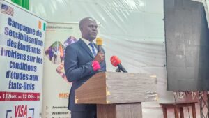 Face au durcissement annoncé de la politique migratoire américaine, le ministère l’Enseignement supérieur et de la Recherche scientifique intensifie sa sensibilisation afin de préparer ses étudiants aux exigences strictes de l’obtention et de l’usage du visa américain. L’amphithéâtre A du district de l’UFHB) a servi de cadre ce mardi 25 novembre 2025, à une vaste campagne de sensibilisation consacrée aux bonnes pratiques liées à l’obtention et à l’utilisation du visa américain.