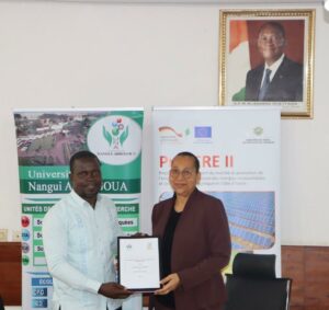 Dans son allocution, Professeur Véronique YOBOUE, Présidente de l’Université Nangui ABROGOUA, a exprimé sa gratitude à l’ensemble des partenaires pour leur engagement en faveur de la formation supérieure, de l’insertion professionnelle des jeunes et du développement durable. Elle a souligné que cette formation duale pilote traduit la vision d’une université ouverte sur son environnement socioéconomique, formant des professionnels compétents, immédiatement opérationnels et en adéquation avec les besoins du marché. Aux entreprises partenaires, elle a adressé ses remerciements pour leur rôle de co-constructeurs de compétences, avant de saluer l’appui constant de la GIZ et de l’Union Européenne à travers le projet ProFERE II.