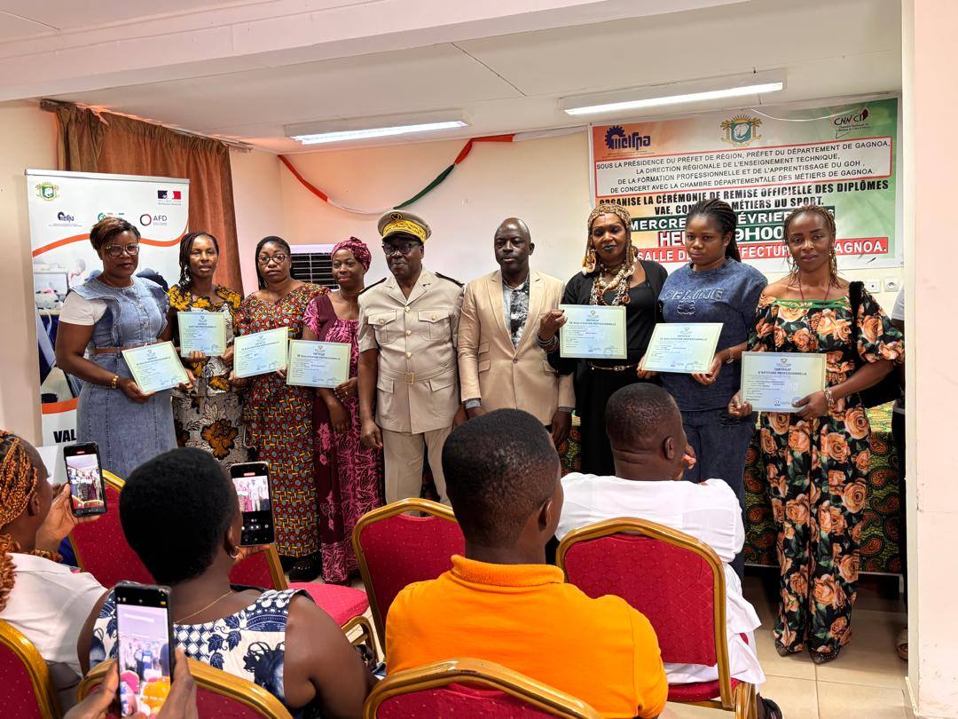 Le mercredi 11 février 2026, la salle de la Préfecture de Gagnoa a accueilli la cérémonie officielle de remise des diplômes aux bénéficiaires des projets de Validation des Acquis de l’Expérience (VAE), du Certificat de Qualification aux Métiers (CQM) et des formations aux Métiers du Sport. Cet événement, placé sous la présidence du Préfet de région représenté par le Secrétaire Général 1, Monsieur Assamoi, marque une étape majeure dans le déploiement de la vision du Ministère de l’Enseignement Technique, de la Formation Professionnelle et de l’Apprentissage (METFPA).