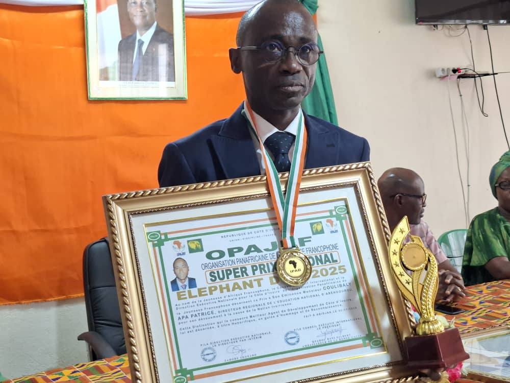 Le Directeur Régional de l’Éducation Nationale, de l’Alphabétisation et de l’Enseignement Technique, Monsieur COULIBALY Apa Patrice, a officiellement reçu mardi 03 février 2026, le prestigieux titre de « Prix Éléphant d’Or ».