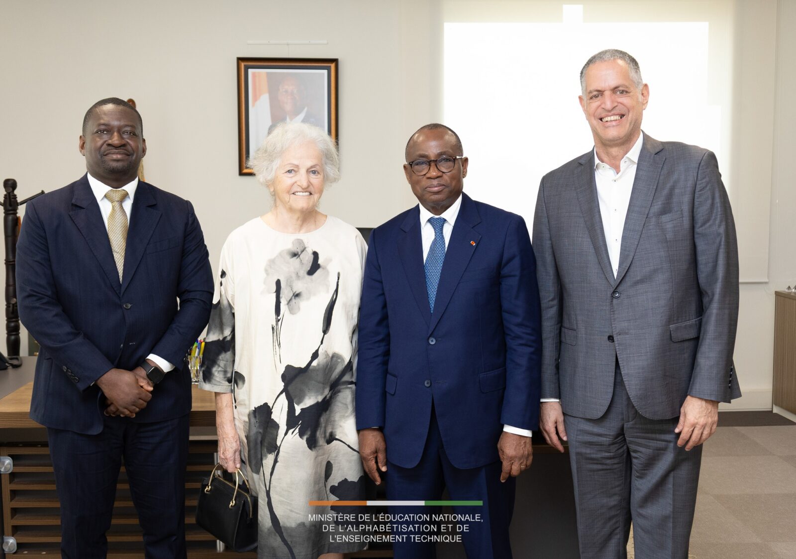Le jeudi 26 février 2026, au 7ᵉ étage de la Tour B, Monsieur N’Guessan KOFFI, Ministre de l’Éducation Nationale, de l’Alphabétisation et de l’Enseignement Technique, a reçu en audience une délégation de la Fondation ATEF OMAÏS, conduite par sa Présidente, Madame Zanouba OMAÏS.