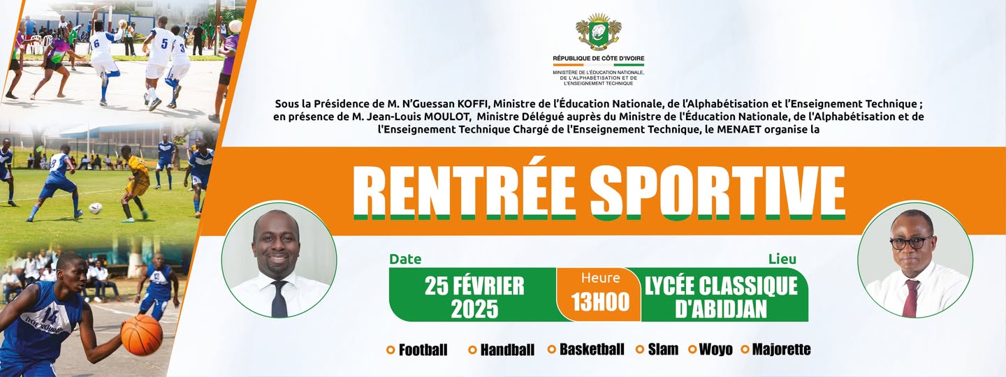 Sous la Présidence de M. N’Guessan KOFFI, Ministre de l’Éducation Nationale, de l’Alphabétisation et de l’Enseignement Technique; en présence de M. Jean-Louis Moulot, Ministre Délégué auprès du Ministre de l’Éducation Nationale, de l’Alphabétisation et de l’Enseignement Technique Chargé de l’Enseignement Technique, le MENAET organise la Rentrée Sportive.