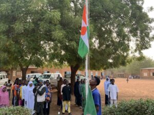 La Ministre de l’Éducation Nationale, de l’Alphabétisation et de la Promotion des Langues, Dr Élisabeth Shérif, a assisté à la traditionnelle montée des couleurs du lundi matin, en présence des cadres centraux et déconcentrés du Ministère, de l’administrateur délégué de l’arrondissement communal Niamey 3, ainsi que des partenaires de l’école nigérienne, notamment les représentants des syndicats et de l’association des parents d’élèves.