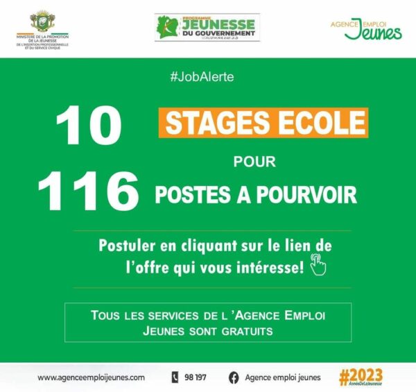Cรดte d’Ivoire / L’agence Emploi Jeunes informe de la disponibilitรฉ de 10 offres Stages Ecole correspondant ร  116 postes