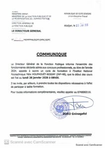Le Directeur Général de la Fonction Publique informe l’ensemble des fonctionnaires déclarés admis aux concours professionnels, au titre de l’année 2024, appelés à suivre un cycle de formation à l’Institut National Polytechnique Félix HOUPHOUET-BOIGNY (INP-HB), que le début des cours est fixé au 𝐥𝐮𝐧𝐝𝐢 𝟐𝟔 𝐣𝐚𝐧𝐯𝐢𝐞𝐫 𝟐𝟎𝟐𝟔 𝐚̀ 𝟎𝟖𝐡𝟎𝟎.